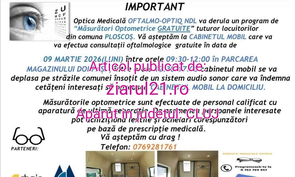 Cabinet mobil disponibil pe 9 martieLocuitorii comunei Ploscoș vor avea ocazia să își verifice gratuit sănătatea ochilor în cadrul unei campanii de consultații oftalmologice organizată prin intermediul unui cabinet mobil de optometrie.Anunțul a fost făcut de Daniel Aitoneanu, care a transmis că acțiunea este dedicată tuturor persoanelor care doresc să își verifice vederea și starea generală a ochilor.Campania va avea loc luni, 9 martie 2026, iar consultațiile vor fi realizate de personal calificat, cu aparatură de ultimă generație.